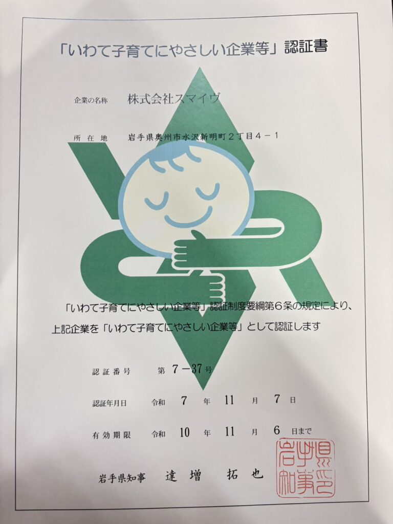 このたび、スマイヴは岩手県より 「いわて子育てにやさしい企業等」に認証されました!🏡