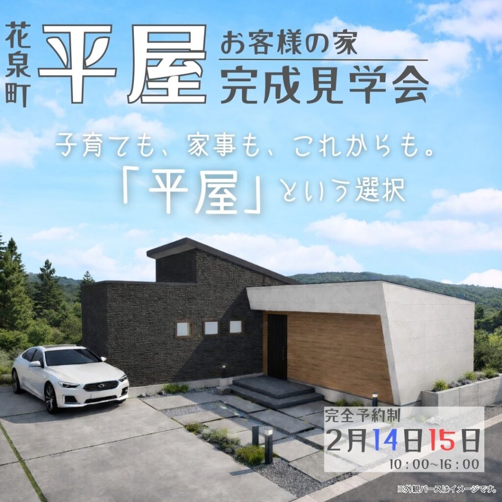 2026年2月14日(土)・15日(日)の2日間、一関市花泉町清津字境にて、お客様のご厚意により【平屋完成見学会】を開催いたします。スマイヴが手がけた、2LDK+WIC/延床66.24㎡(20.03坪)の等身大の住まいをご体感いただけるチャンスです。
